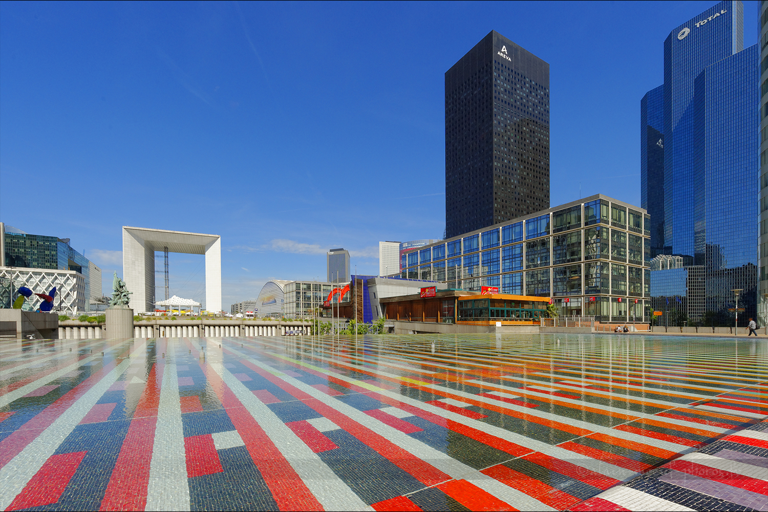 La Fontaine Agam est située vers le milieu de l'esplanade de la Défense (Paris)