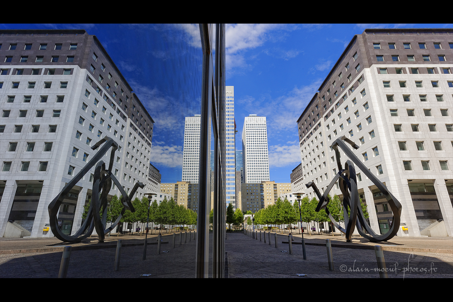 Photo de l’œuvre de Bernar Venet, les Doubles Ligne Indéterminées dans le quartier Michelet à la Défense (Paris)
