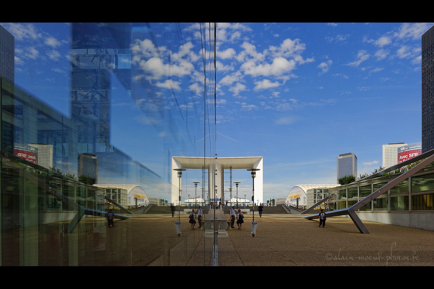Photo du parvis et de la Grande Arche de à la Défense qui se reflète dans la façade vitrée d'une tour.
