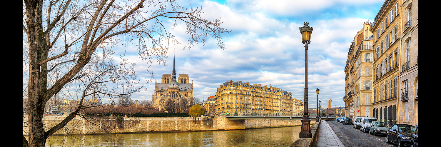 Photo panoramique prise du quai d'Orléans. Elle couvre un panorama qui s'étend de la Cathédrale Notre-Dame de Paris à la Tour Saint Jacques.