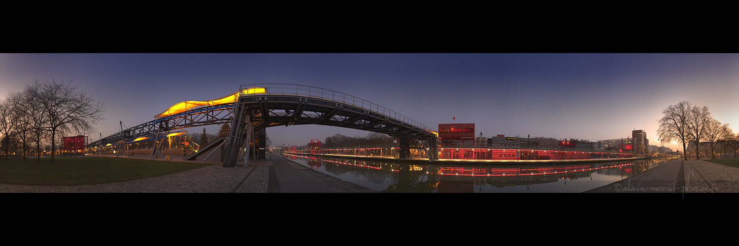 Ce panoramique de 300° du canal de l'Ourcq et des Galeries de L'Ourcq et de la Villette est réalisé de l'allée du Canal dans le parc de La Villette. C'est un panoramique réalisé à partir de 32 photos.
