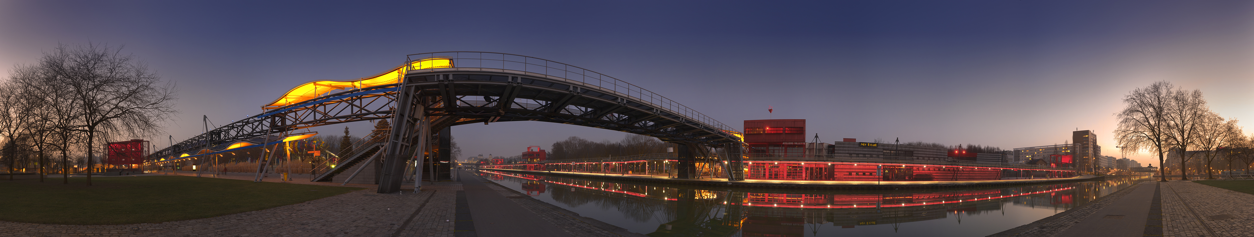 Ce panoramique de 300° du canal de l'Ourcq et des Galeries de L'Ourcq et de la Villette est réalisé de l'allée du Canal dans le parc de La Villette. C'est un panoramique réalisé à partir de 32 photos.