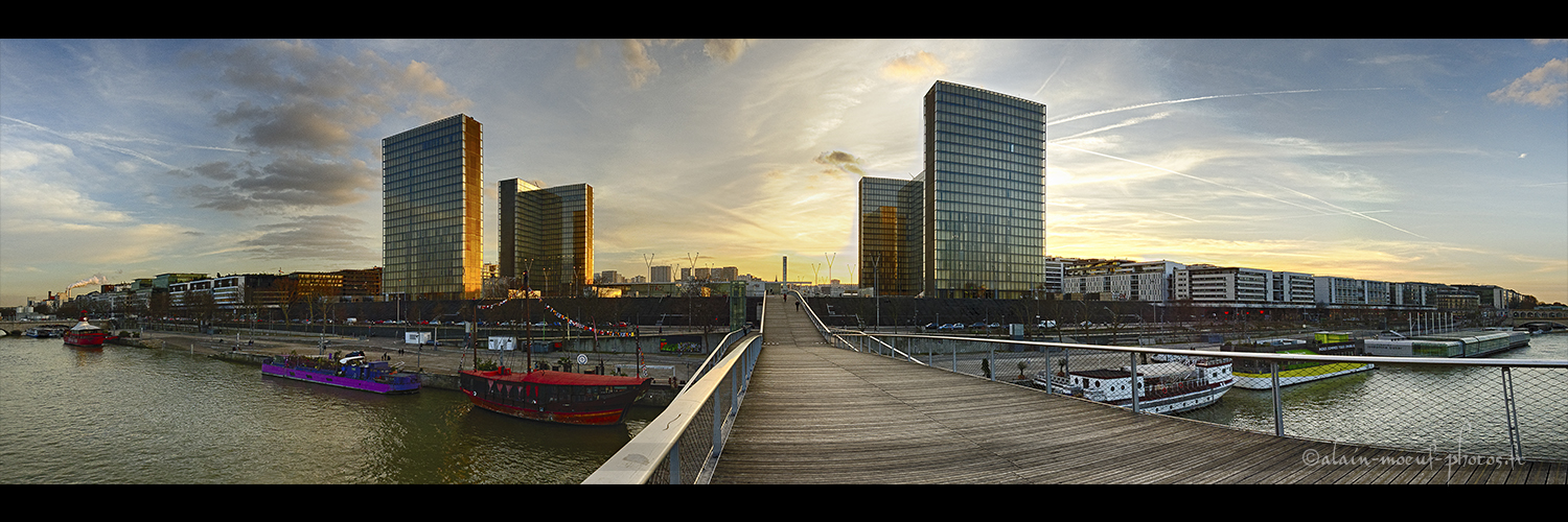 Ce panoramique de la Bibliothèque Nationale de France est réalisé depuis la passerelle Simone de Beauvoir . C'est une photo construite à partir de 3 photos.