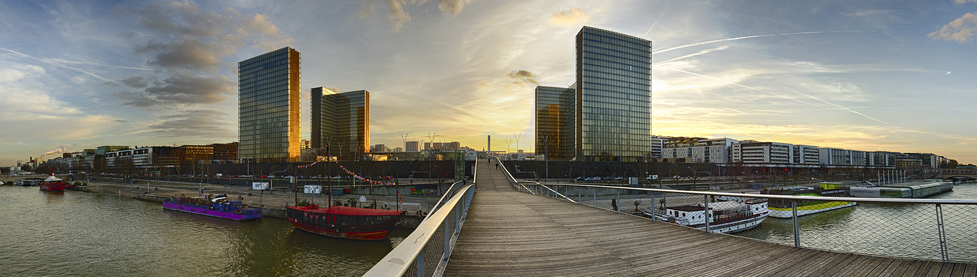 Ce panoramique de la Bibliothèque Nationale de France est réalisé depuis la passerelle Simone de Beauvoir . C'est une photo construite à partir de 3 photos.