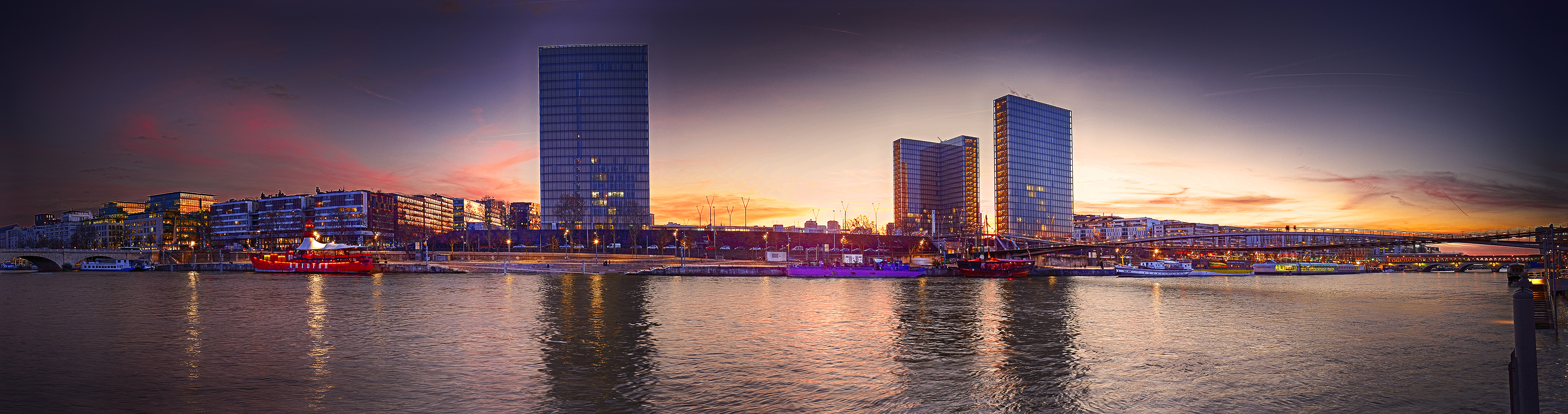 Ce panoramique de la Bibliothèque Nationale de France et du port de la gare est réalisé depuis la rive droite de la seine côté Bercy . C'est une photo construite à partir de 3 photos.
