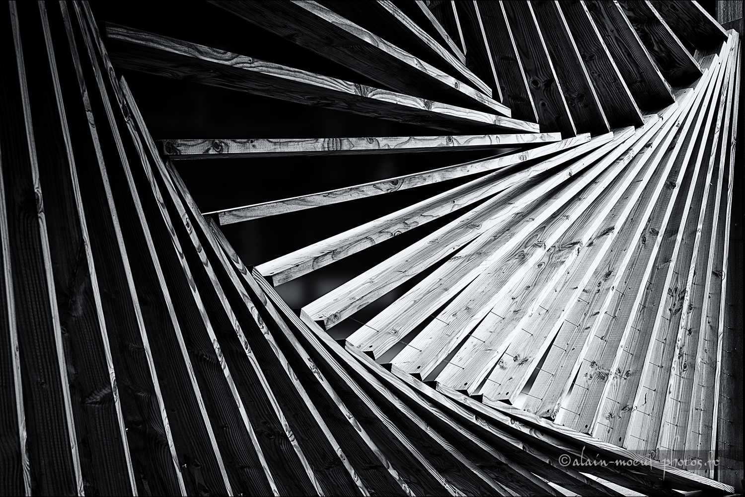 Les barrières de lattes de bois qui clôturent l'espace Chapiteaux du Parc de la Villette, sont posées de façon à créer ces formes particuliéres