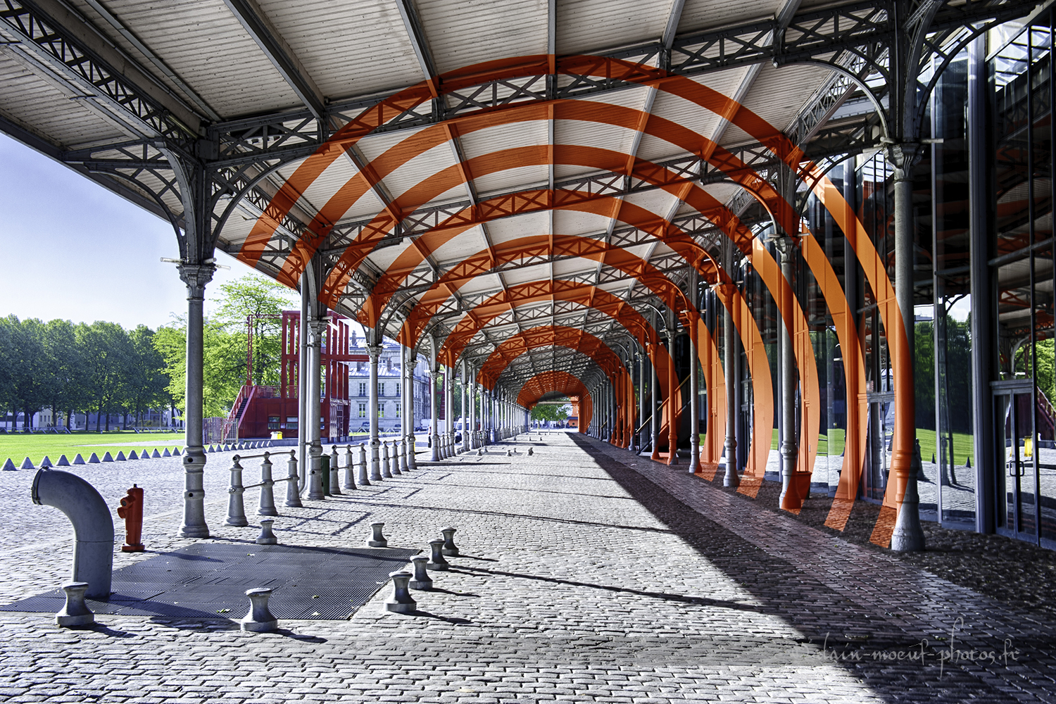 Ce n'est pas un montage Photoshop®, mais une oeuvre (la peinture ... pas la photo). C'est Felice Varini qui a réalisé cette peinture directement sur la structure de la Grande Halle de la Villette et se termine sur le mur du café des concerts. On la découvre pleinement que d'un point précis à l'entrée nord de la coursive.