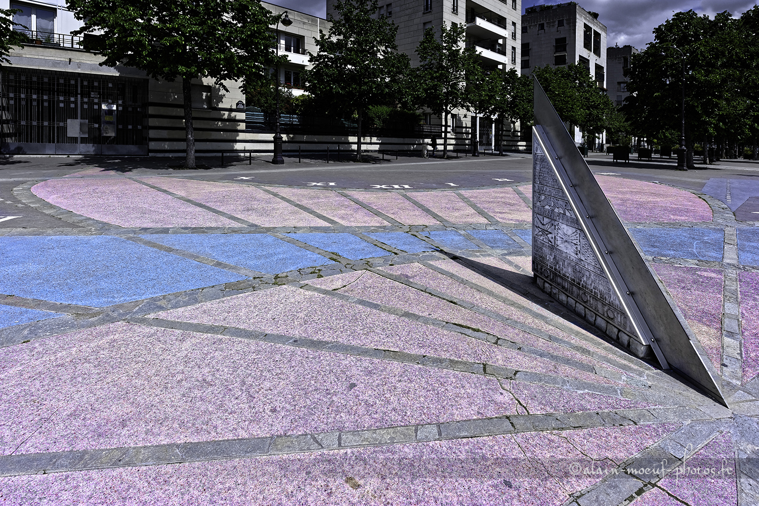 A l'entrée du Jardin de Reuilly-Paul-Pernin (Paris 12ème), à l'angle de la rue Jacques-Hillairet et la coulée verte René-Dumont, vous avez ce cadrant solaire horizontal créé par par deux artistes, M.Régine Doucet et M. Jean-Loup Doucet.