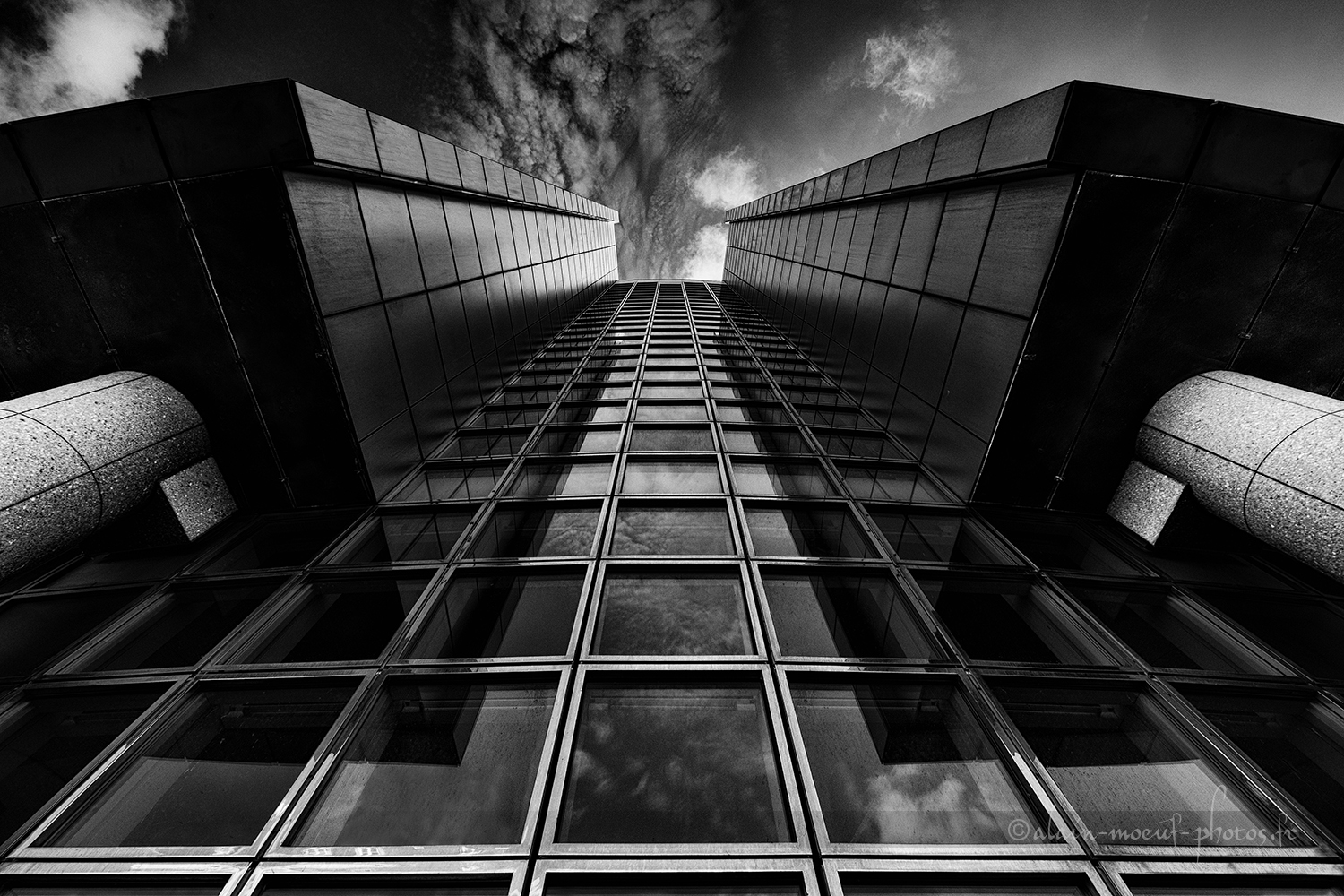 Cette parois vitrée vue en contre-plongée crée une perspective à la fois par sa propre structure mais aussi par les reflets des deux avancées métalliques soutenues par les colonnes de béton.