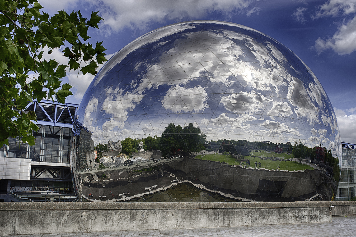 Les miroirs de la Géode du Parc de la Villette la font quasiment disparaître en la transformant en une bulle de ciel.Les miroirs de la Géode du Parc de la Villette la font quasiment disparaître en la transformant en une bulle de ciel.