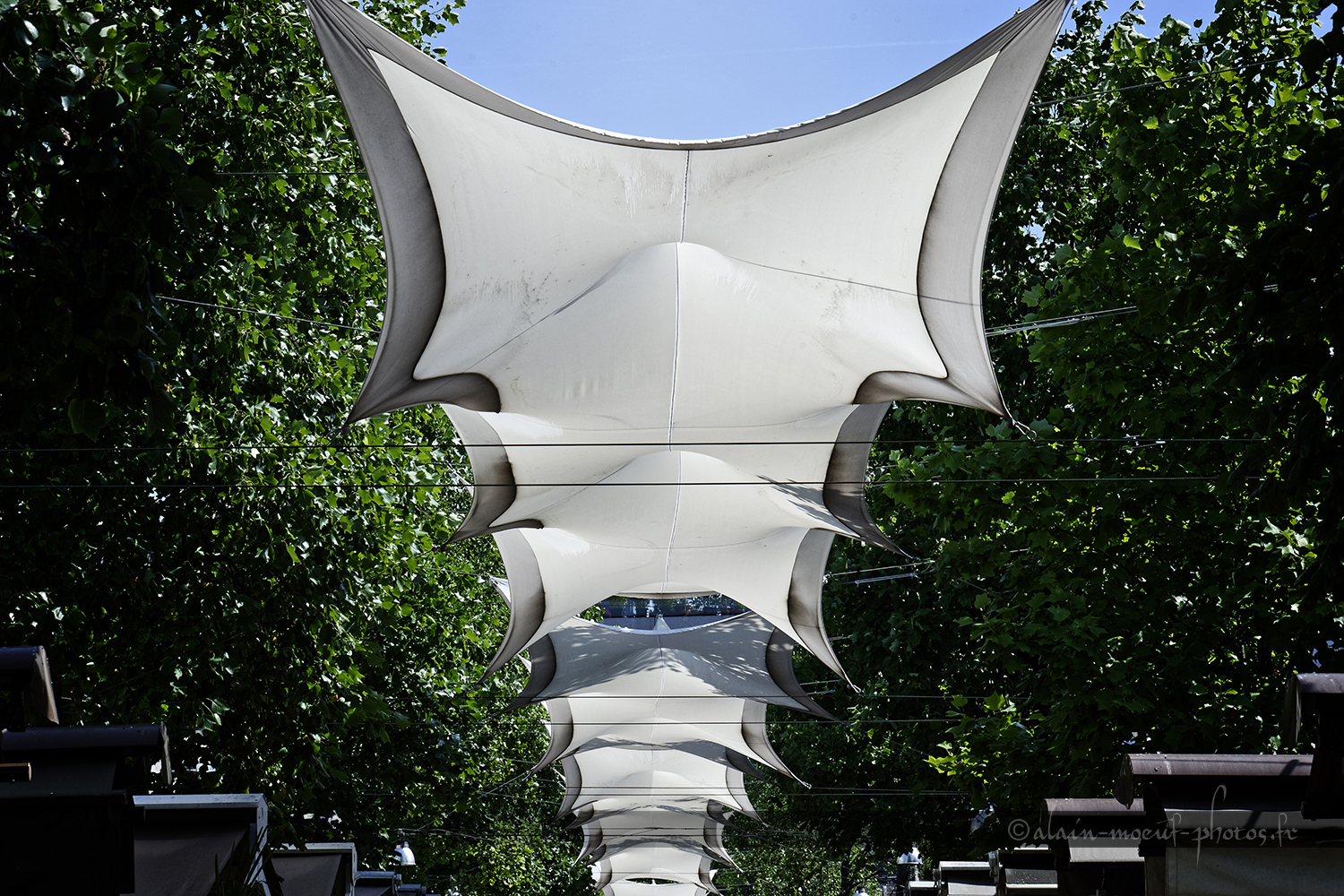 Cette voile recouvre la cour Saint-Emilion dans le parc de Bercy à Paris.