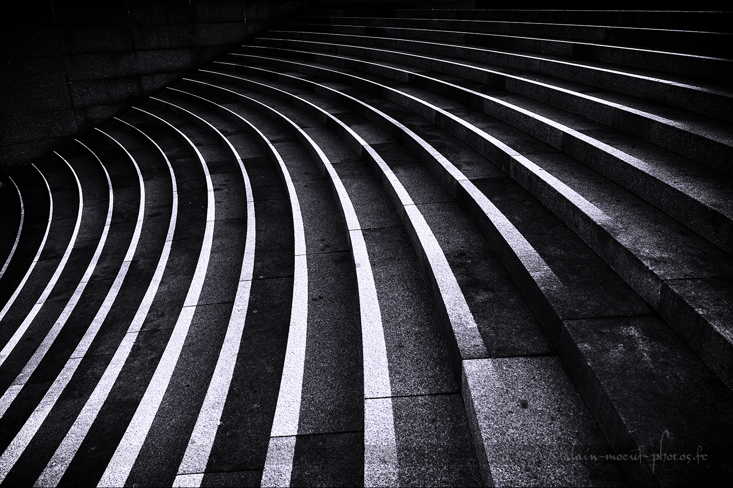 Photo de l'escalier courbe au pied de la Grande Arche à La Défense Paris.