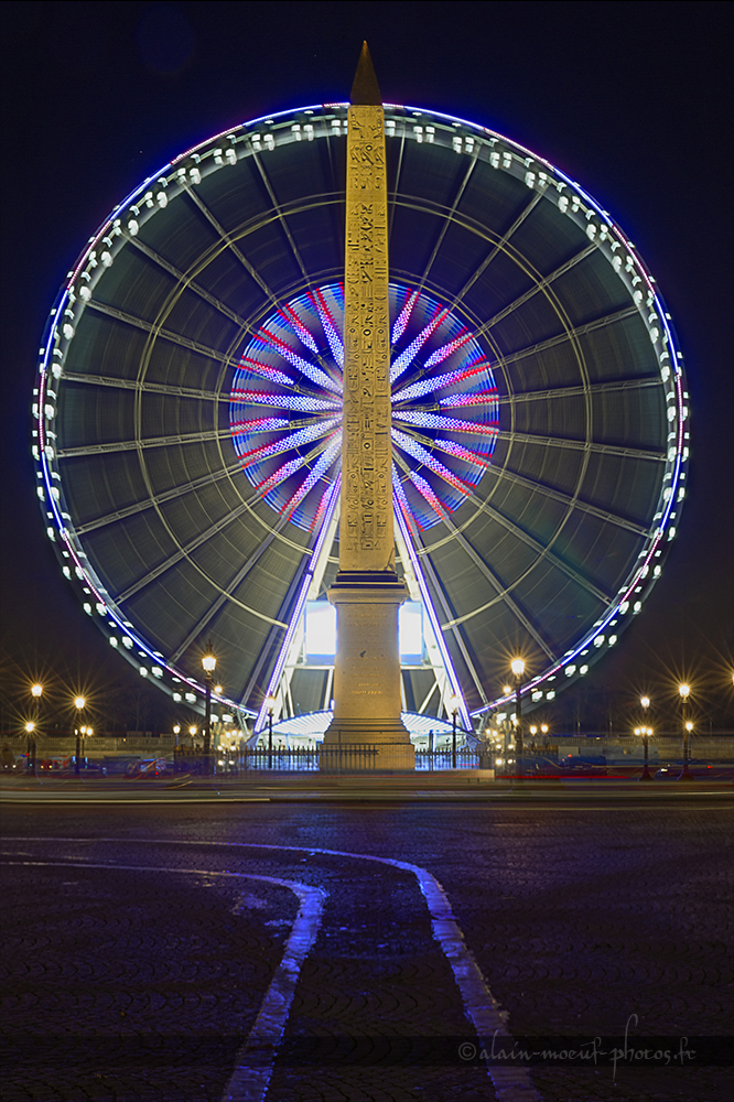 La prise de vue est réalisée au bas de l’avenue des Champs-Élysées. En arrière plan de l'Obélisque il y la Grande Roue.