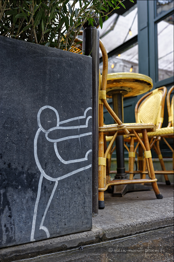 Street Art sur un bac à fleurs du café La Palette, rue Jacques Callot, Paris (6ème).