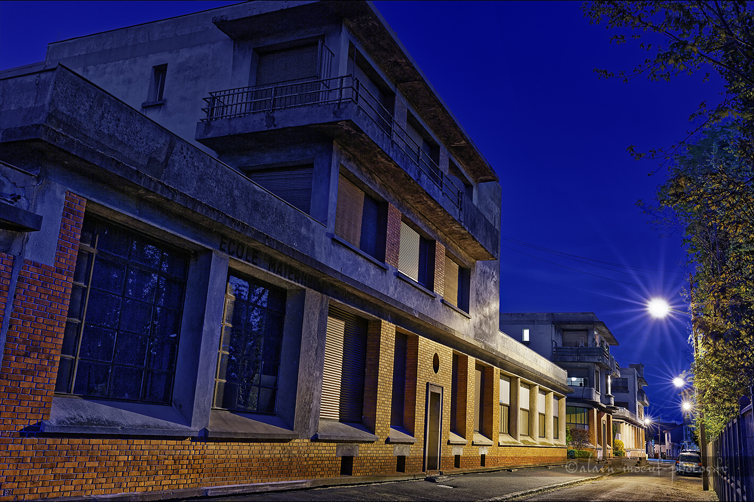 Photo de l'ancienne école J. Ferry, prise de nuit dans l'Allée du Portugal à Draveil.