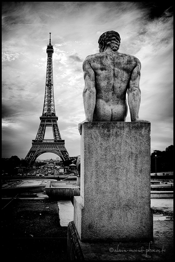 L’Homme, la statue de Pierre Traverse, qui surplombe la fontaine du Trocadéro, regarde l’autre monument de Paris la Tour Eiffel.