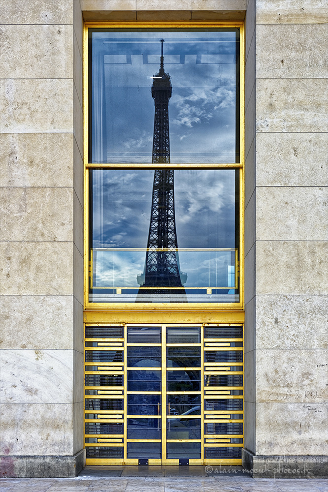 Reflet de la Tour Eiffel dans l'une des vitres du Palais de Chaillot.
