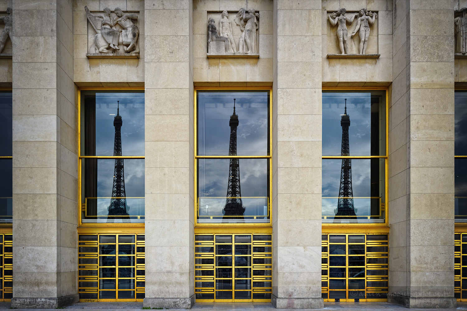 3 Reflets de la Tour Eiffel dans les vitres du Palais de Chaillot.