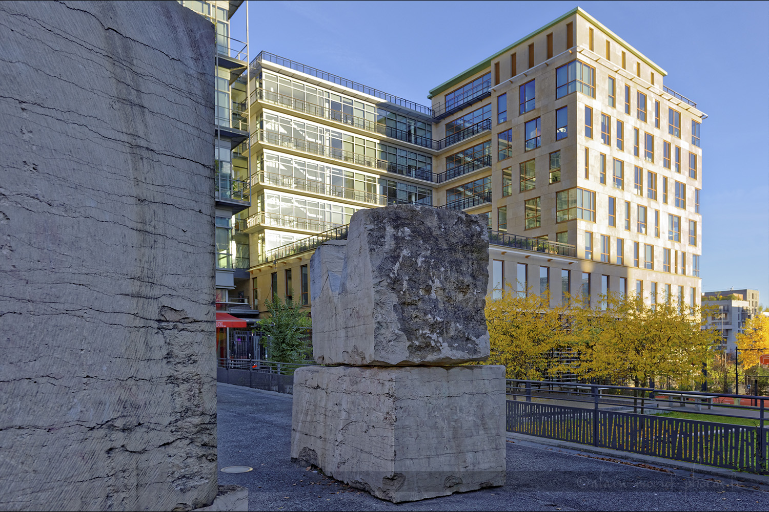 A l’angle de la rue des Grands Moulins et de l’avenue de France (15ème Paris) 5 blocs de pierre viennent en contre point des bâtiments en arrière-plan.