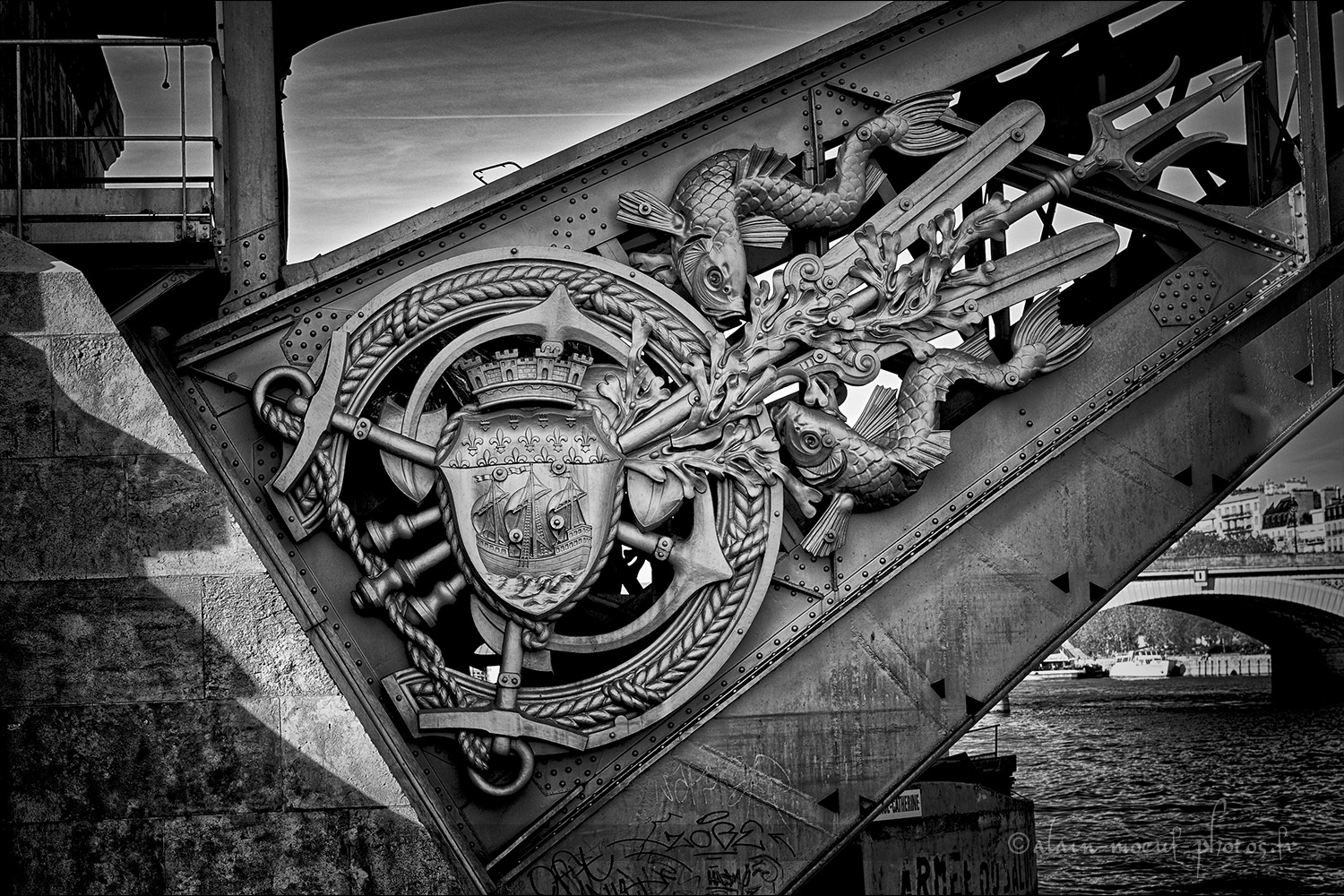 L'un des motifs décoratifs du viaduc d'Austerlitz, coté quai d’Austerlitz. Le viaduc d'Austerlitz est un pont ferroviaire qui franchit la Seine à Paris (France) ; il est emprunté par les rames de la ligne 5 du métro de Paris. Il relie la station Gare d'Austerlitz, située sous la halle de la gare d'Austerlitz, à la station Quai de la Rapée.