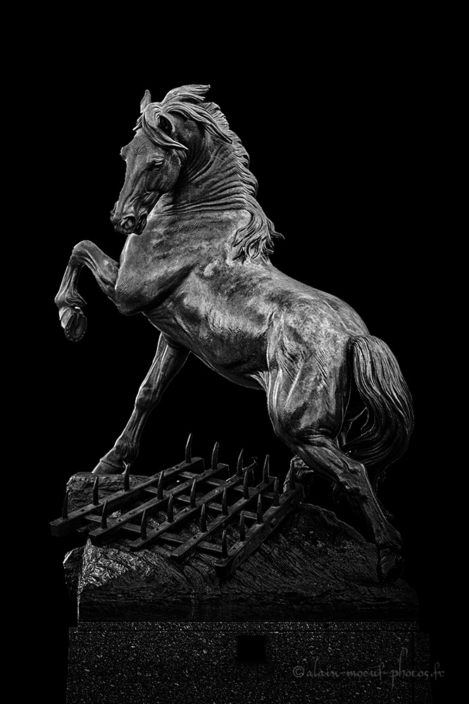 Cheval à la herse de Pierre Louis Rouillard (Paris, 1820-1881), 1878, fonte de fer, sur le parvis du musée d'Orsay à Paris. Il faisait parti d'un ensemble de quatre statues monumentales en fonte de fer et dorées à l'origine (un Taureau d'Auguste Caïn, un Éléphant d'Emmanuel Frémiet, un Rhinocéros de Henri-Alfred Jacquemart et le Cheval) qui entouraient la fontaine devant le palais du Trocadéro.