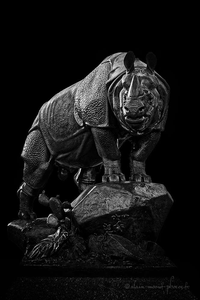 Rhinocéros de Henri-Alfred Jacquemart (Paris, 1824-1896), 1878, fonte, sur le parvis du musée d'Orsay à Paris. Œuvre réalisée pour l'Exposition universelle de 1878 à Paris. Il faisait partie d'un ensemble de quatre statues monumentales en fonte de fer et dorées à l'origine (un Cheval de Pierre Louis Rouillard, un Taureau d'Auguste Caïn, un Éléphant d'Emmanuel Frémiet et le Rhinocéros) qui entouraient la fontaine devant le palais du Trocadéro.