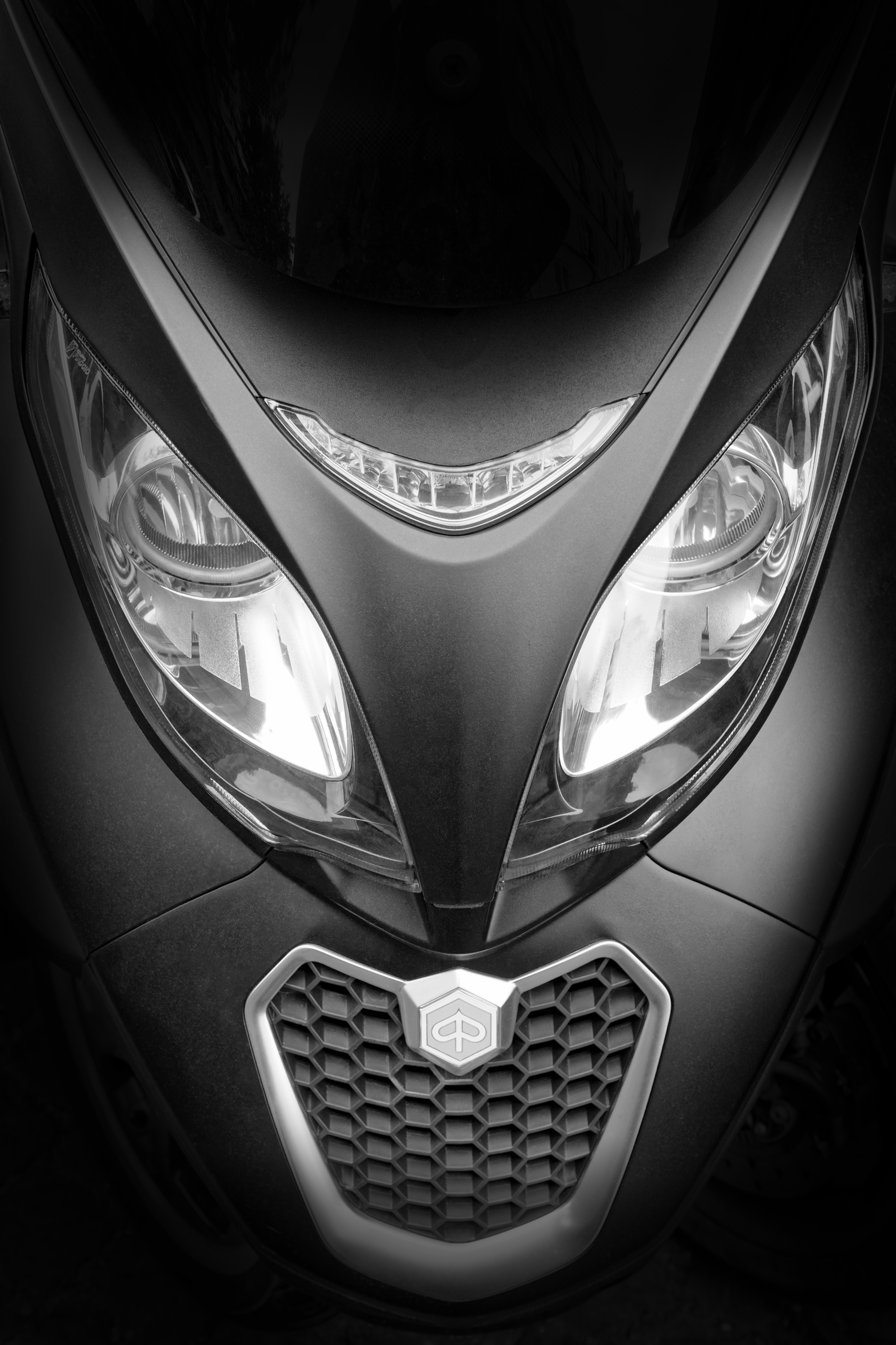 La coque avant d'un scooter, avec ses deux optiques et sa prise d’air, se transforme un masque sous cet éclairage. .