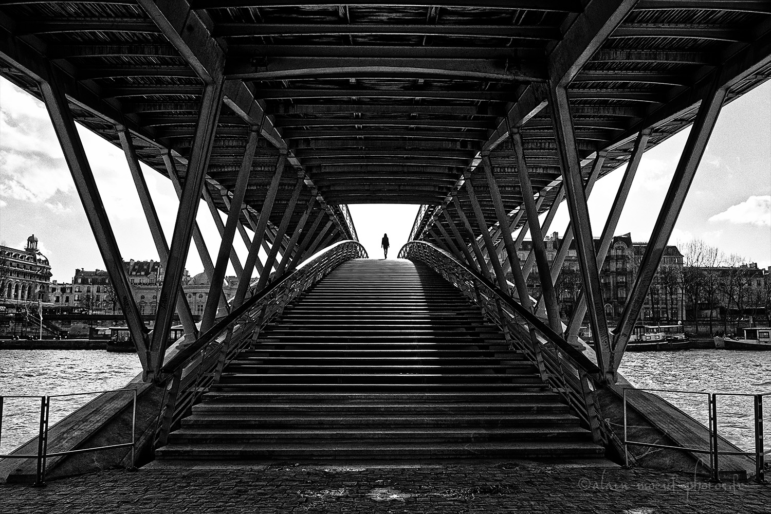 Photo prise sous la Passerelle Léopold-Sédar-Senghor (anciennement passerelle Solférino), est un pont piéton traversant la Seine à Paris, pour relier le port de Solférino (7e arrondissement) au port des Tuileries (1er arrondissement).