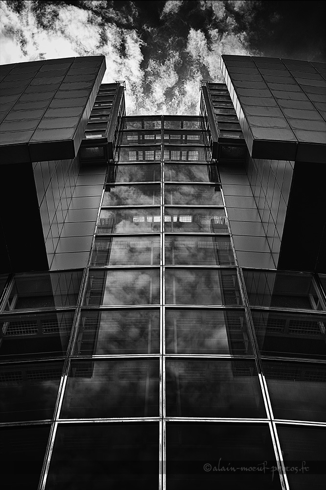 Cette parois vitrée vue en contre-plongée crée une perspective à la fois par sa propre structure mais aussi par les reflets des deux avancées métalliques.