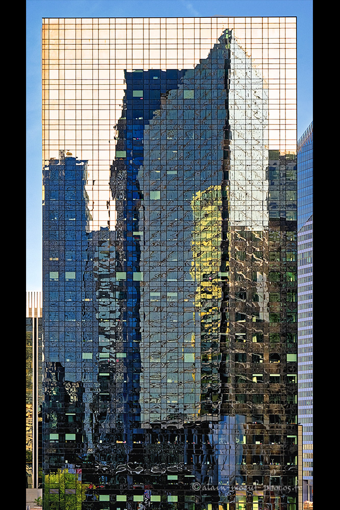 Reflets dans la tour Prisma à la Défense. Photo prise de passerelle qui vient de la place des reflets