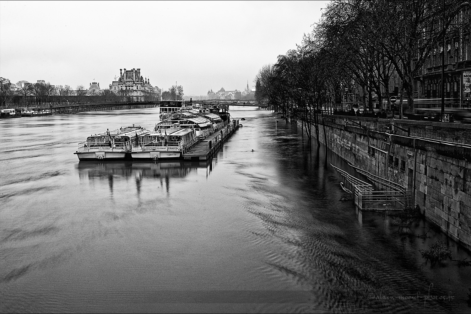 Photo prise du pont du Carrousel. Le ports des Saints Pères recouvert par la crue de la Seine en février 2018