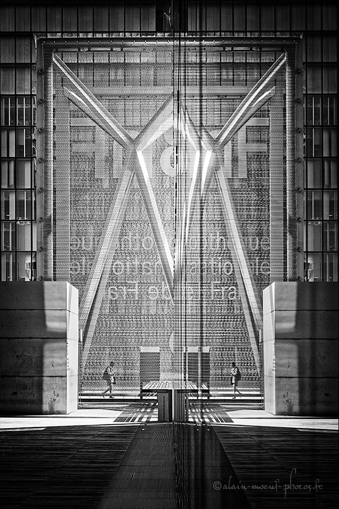 Reflet du portique de l'entrée à la Bibliothèque nationale de France, Paris