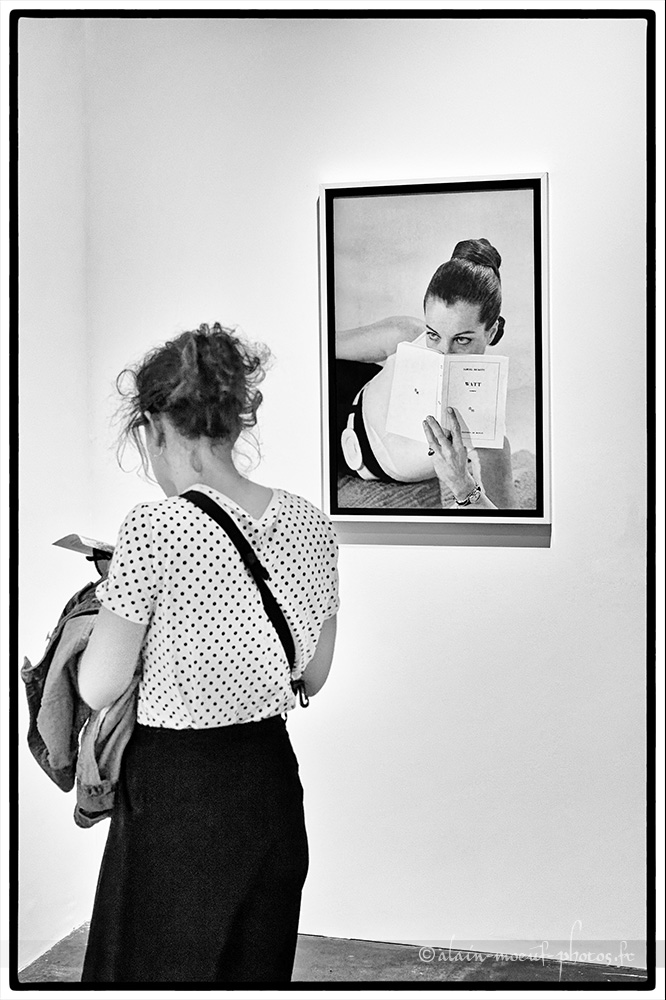 Photo réalisée lors de l'exposition Gilles Caron à l'Hotel de Ville de Paris en 2018. Dans le cadre : photo réalisée par Gilles Caron de Romy Schneider tenant le roman Watt de Samuel Beckett, sur le plateau de télévison de Daisy de Galard "Dim, Dam, Dom" Paris - 17 février 1969
