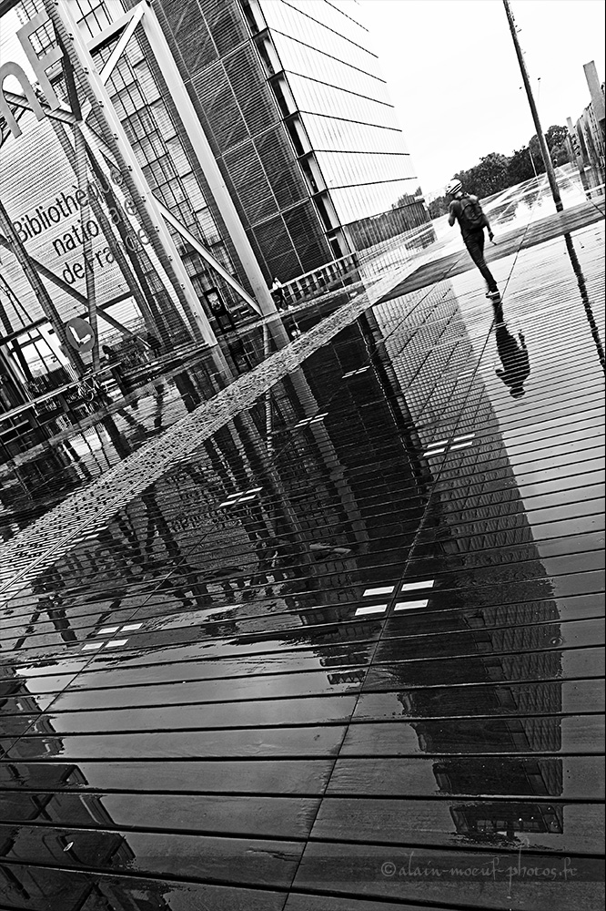Photo réalisée après la pluie sur l'esplanade de la Bibliothèque nationale de France (BnF), Paris