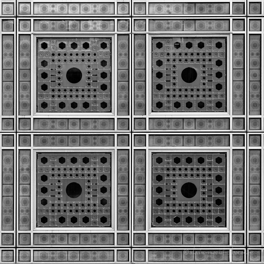 Photo de 4 moucharabiehs de la façade de l'Institut du monde arabe à Paris (5e arrondissement).