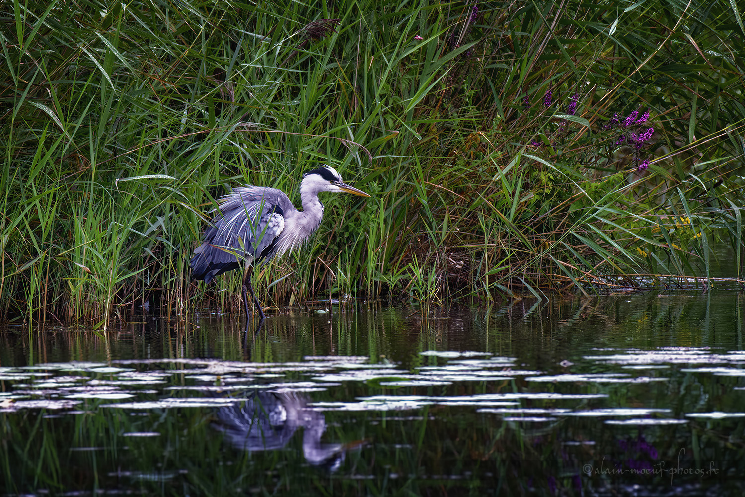 Un héron cendré, pour plus d'information sur cet oiseau ; https://www.oiseaux.net/oiseaux/heron.cendre.html