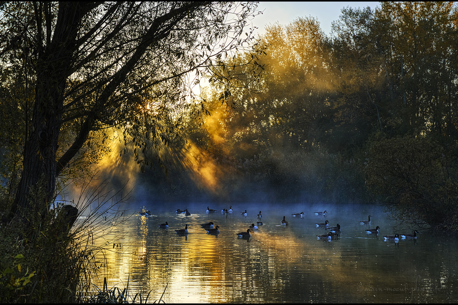 Des Bernaches du Canada dans la brume du matin , pour plus d'information sur cet oiseau ; https://www.oiseaux.net/oiseaux/bernache.du.canada.html