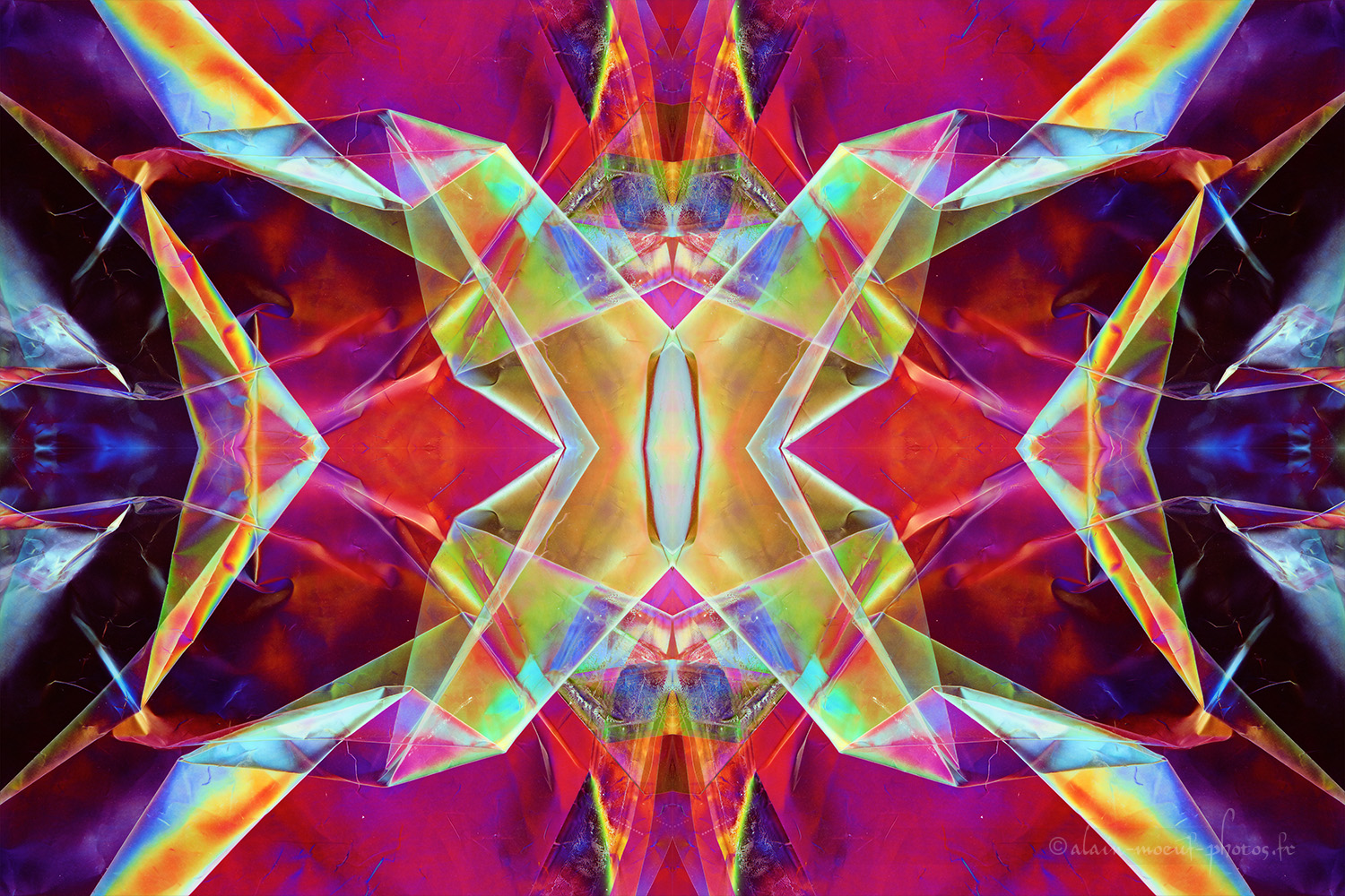 Abstraction par post-traitement. Prise de vue en lumière polarisée, puis effet kaleidoscope par construction graphique