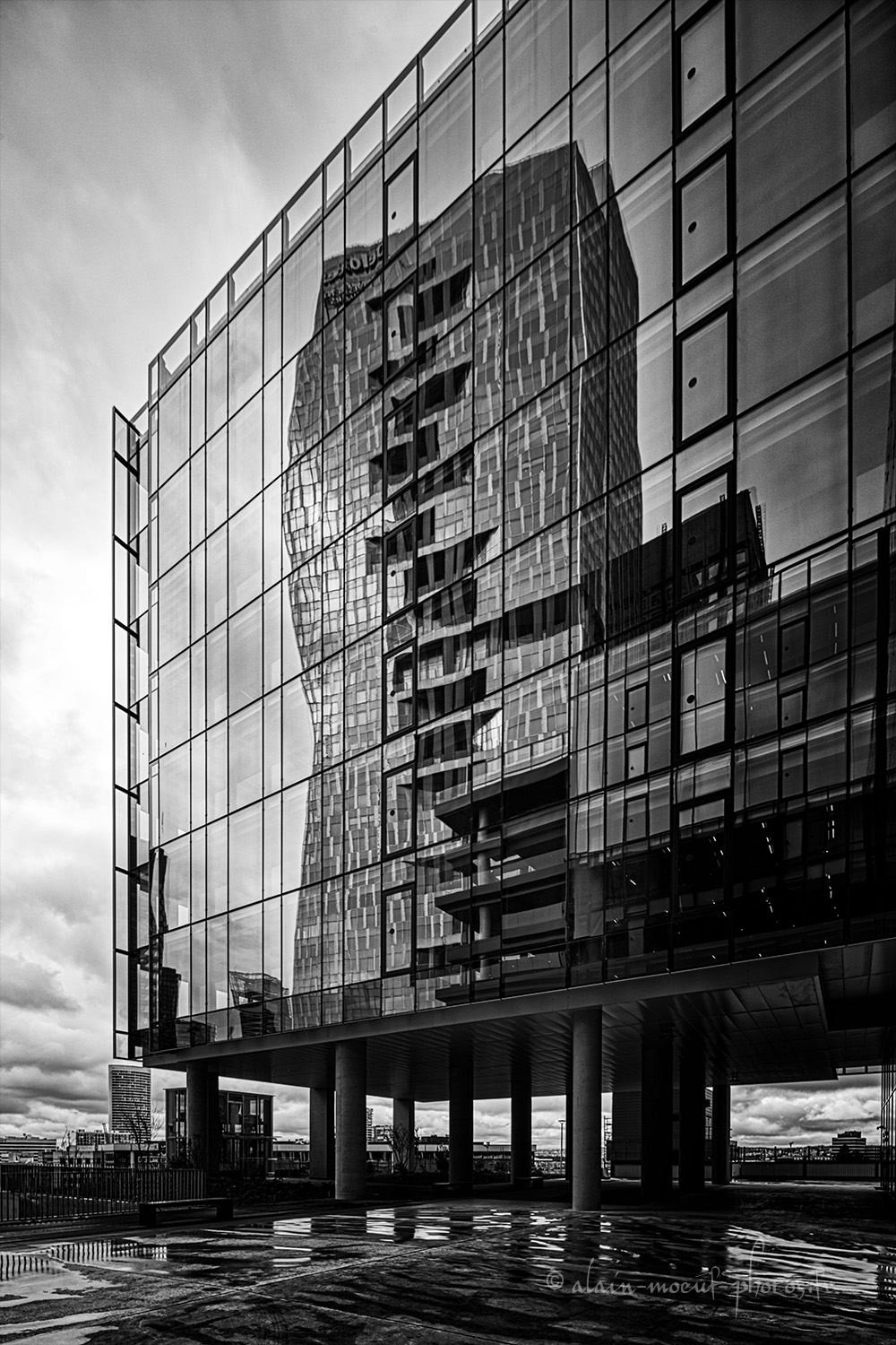 Photo de la tour Tour Majunga qui se reflète un bâtiment de la défense, Paris