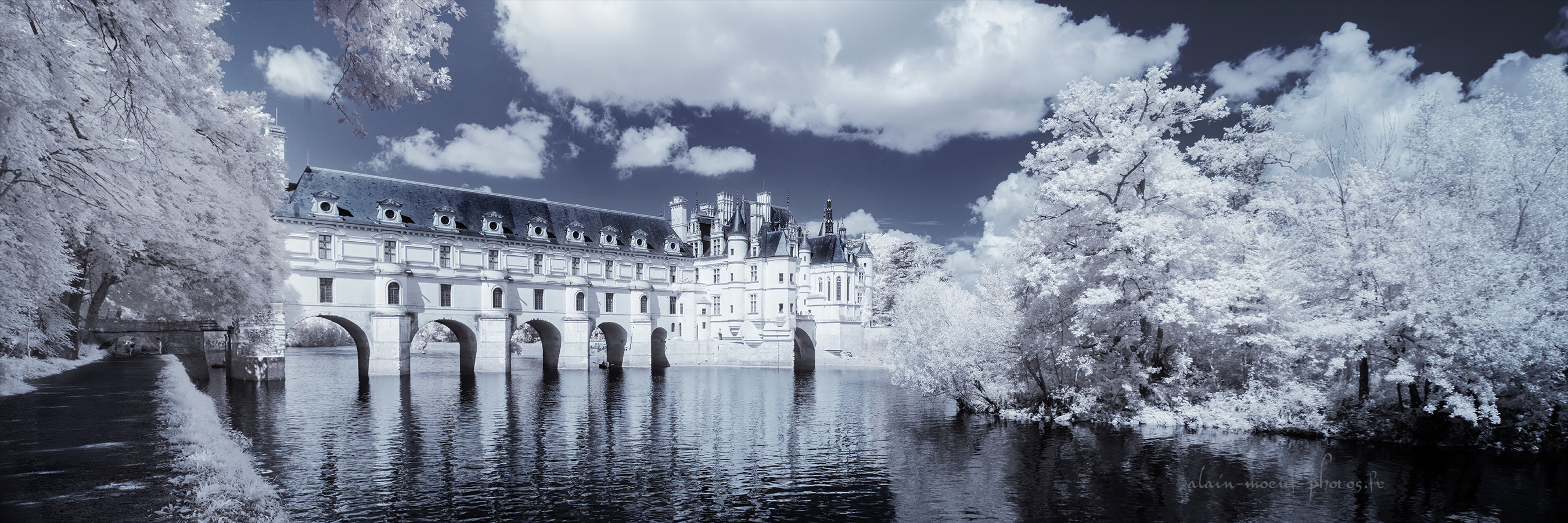 Photo panoramique du Château de Chenonceau, réalisée par association de 3 photos,faite en infrarouge, avec filtre 720 nm.