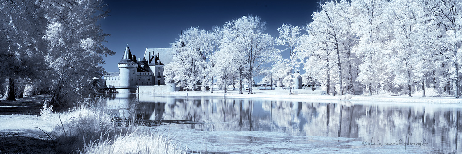 Photo pânoramique, avec 3 photos, en infra rouge, avec un filtre 720nm, du Château de Sully-sur-Loire.