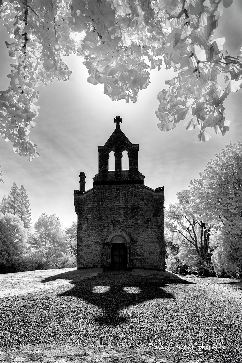 Photo HDR (5 vues) en infra rouge avec filtre 850nm , de la chapelle du Château de Roquetaillade, à Mazères, en Gironde.