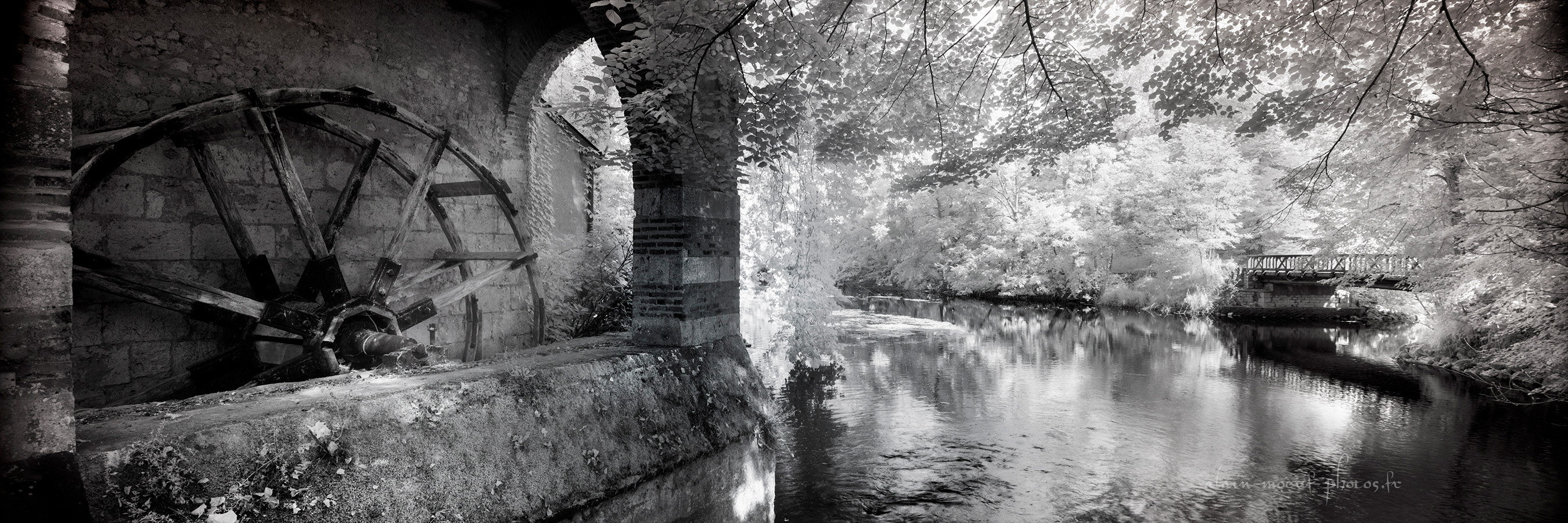 Photo pânoramique, avec 3 photos, en infra rouge, avec un filtre 850 nm, du Moulin des Béchets, dans le Loiret.